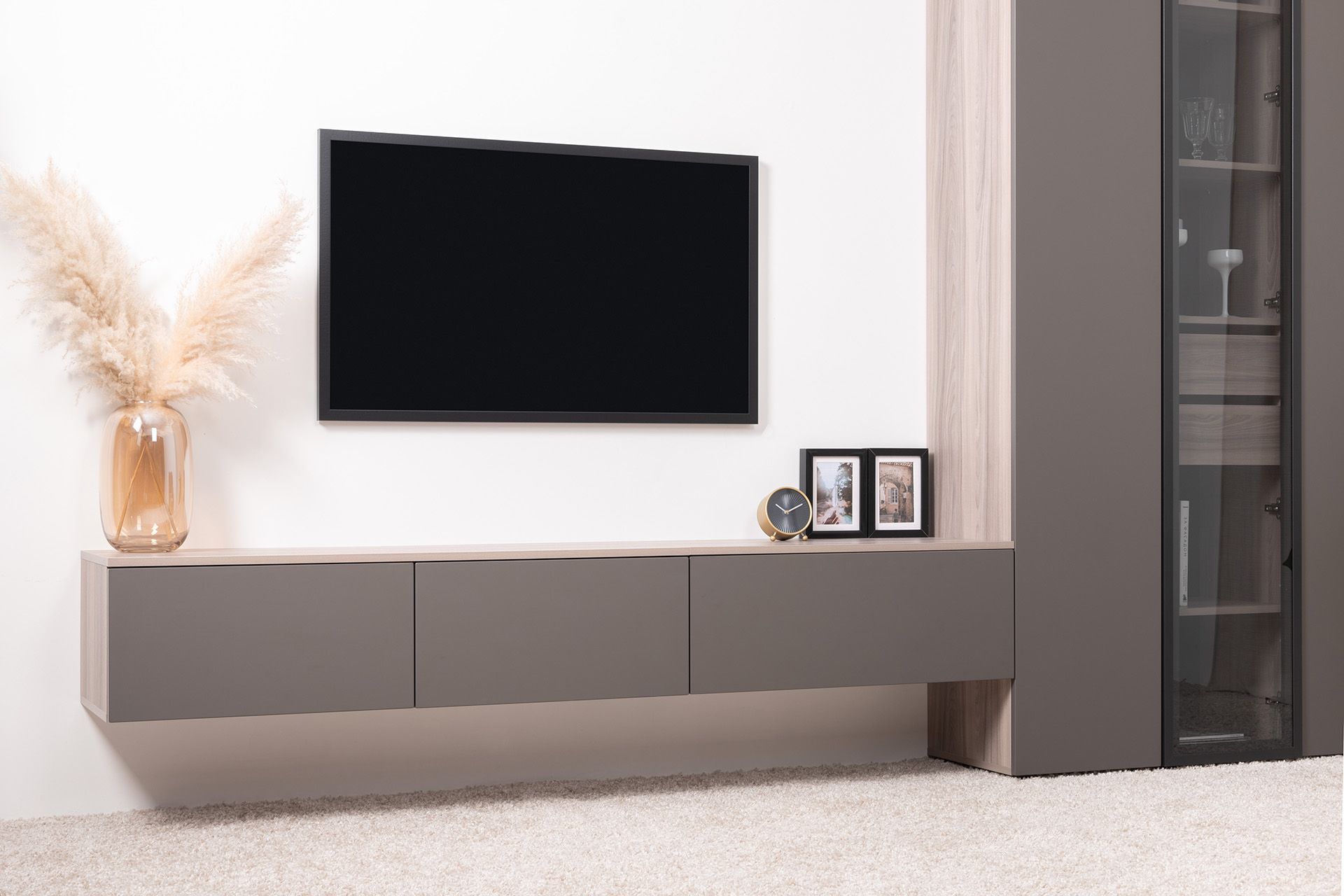 - Подвесная тумба под телевизор монтируется на стену и не касается пола. Она визуально делает пространство легче и упрощает уборку — под ней легко проехать пылесосу.