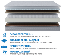 Наполнитель: вязкоэластичный ППУ, сизаль 10 мм, латексированная кокосовая плита 10 мм, термовойлок, латексированная кокосовая плита 20 мм, ячеистая пена с эффектом микромассажа.