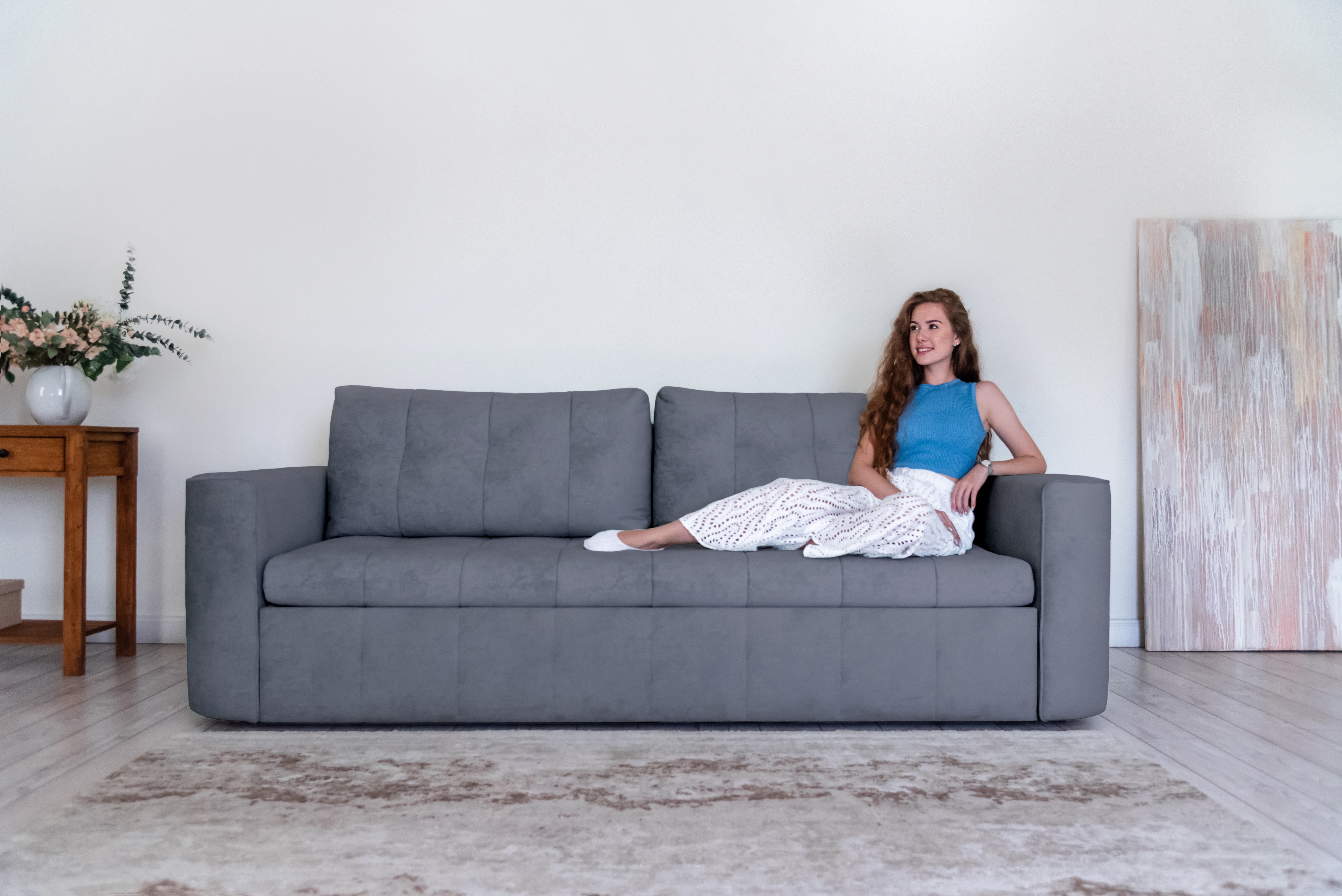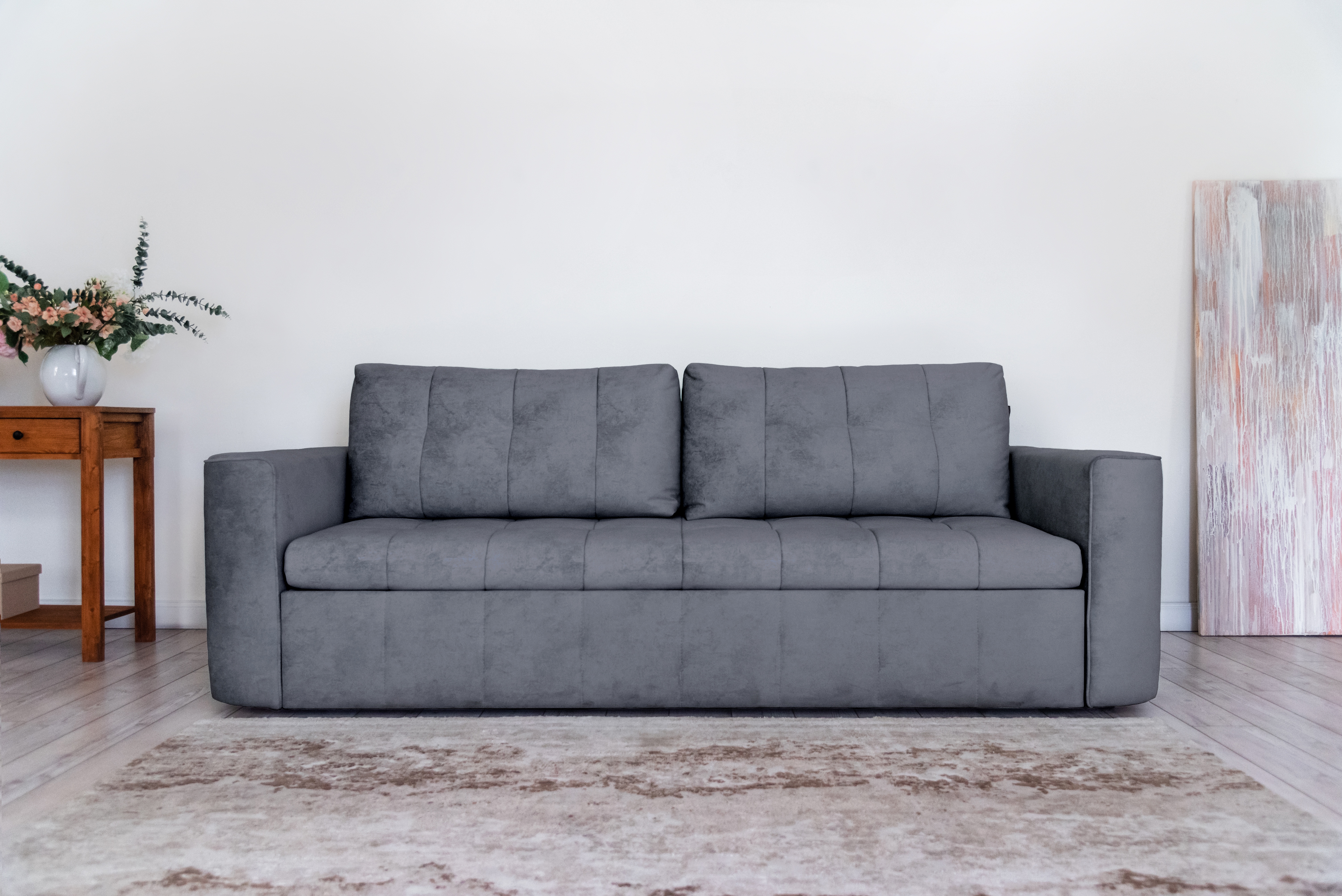 Стильный прямой диван BOSTON создан для тех, кому важна практичность и комфорт: надежный металлокаркас, мягкие ткани и быстрая трансформация в спальное место! Спинка защищает от соприкосновения со стеной во время сна.