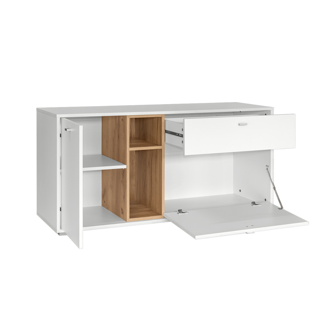Правое занимает выдвижной ящик и секция с откидной дверкой.