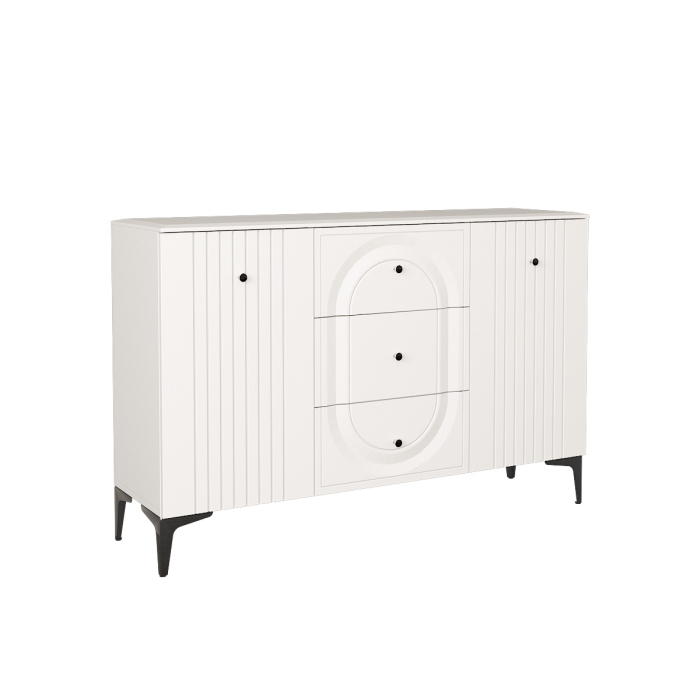 Вся лицевая фурнитура металлическая, графичное и стильное сочетание черного и хромированных деталей эффектно расставляет акценты на мебели.