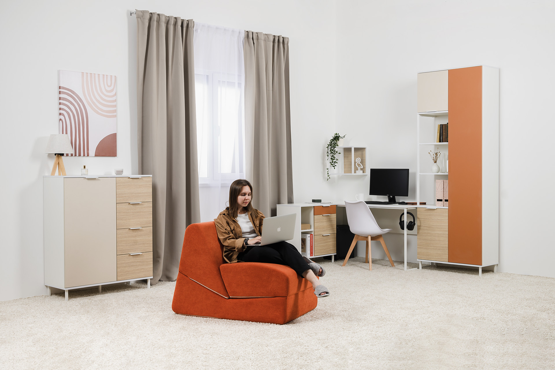 Стильное бескаркасное кресло имеет 3 положения для отдыха.