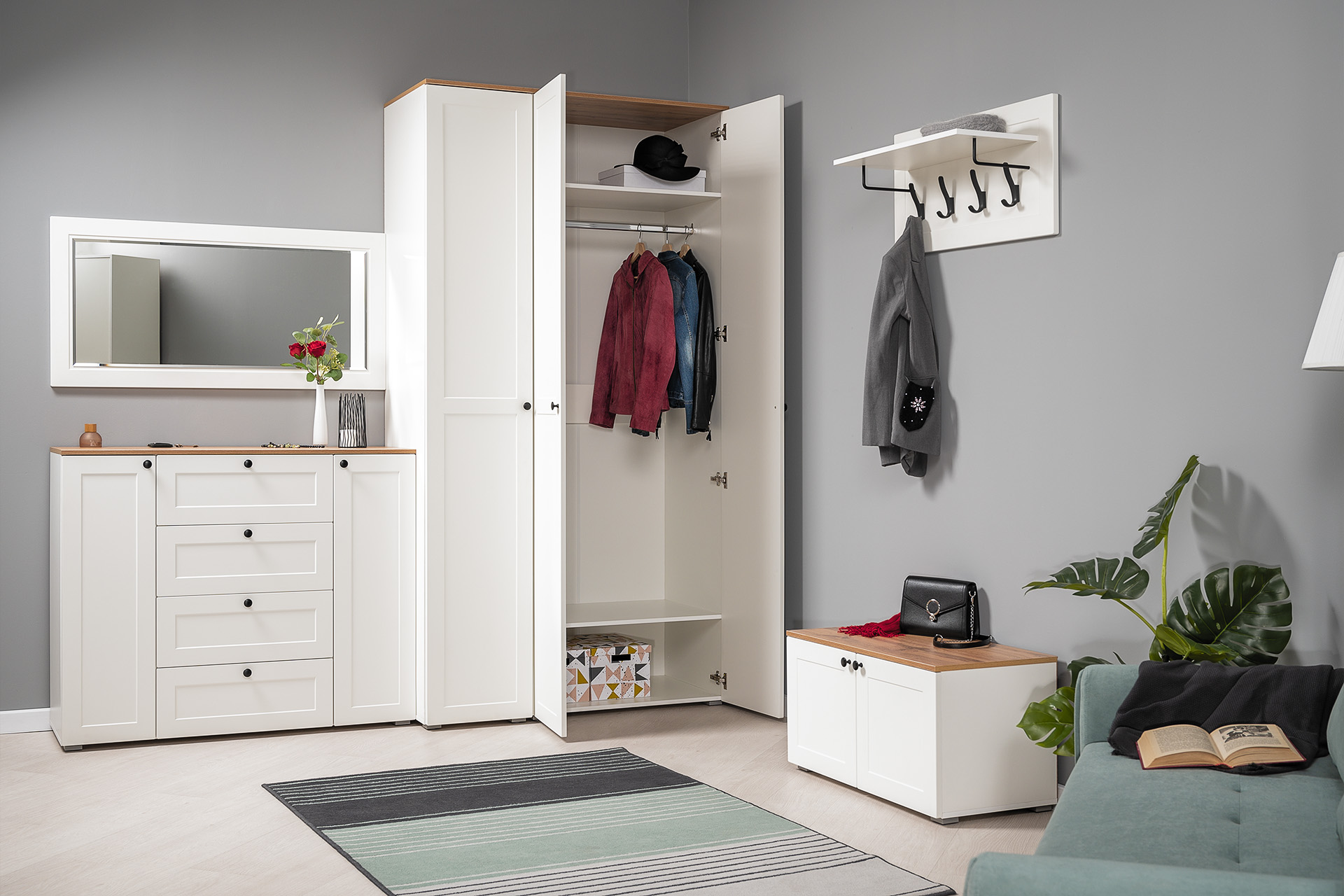 Вместительная шкафная группа позволит оптимально организовать хранение, а продуманные габариты тумбы, комода и зеркала дают возможность собрать различные компоновки.