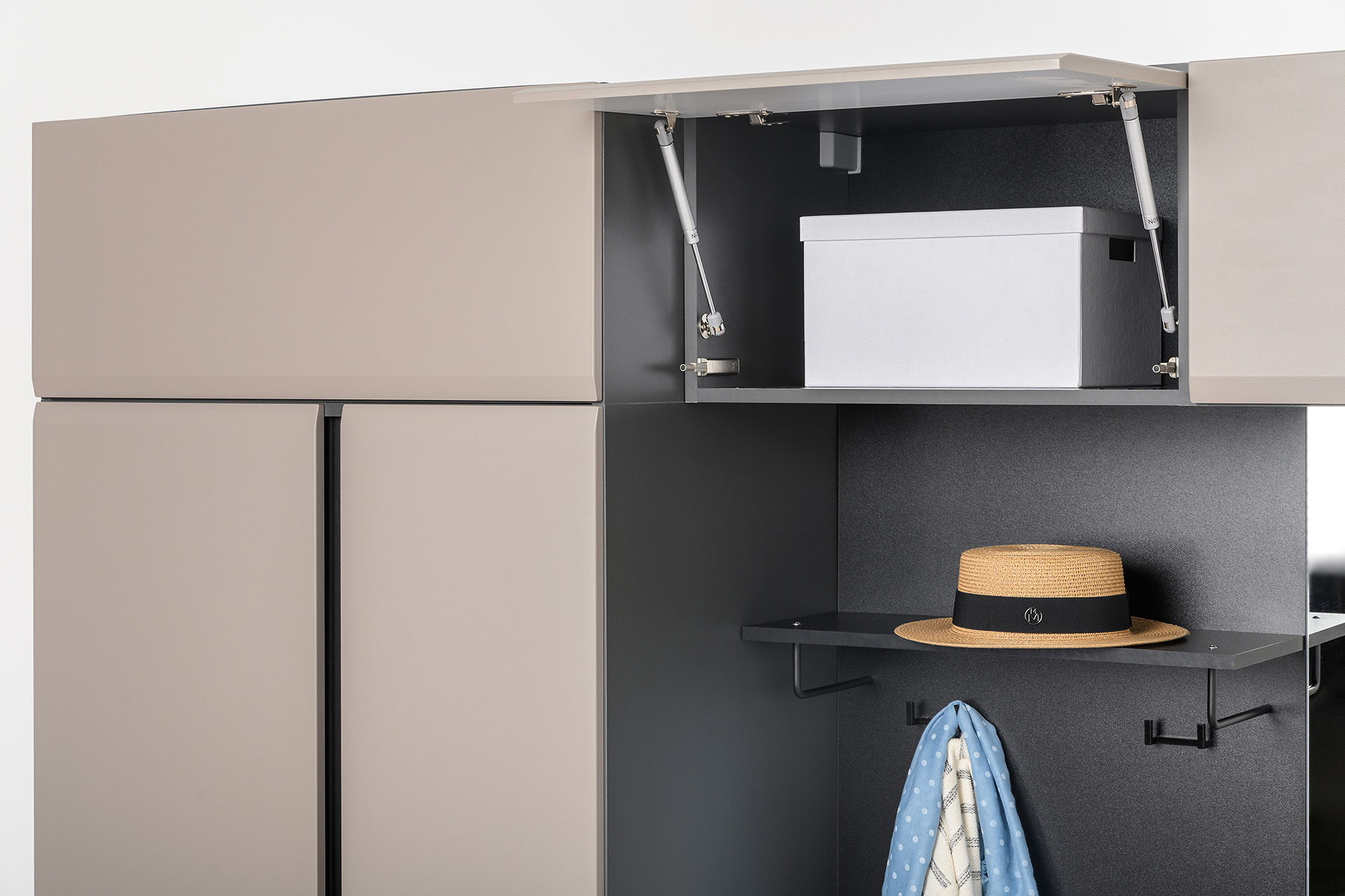 Конструкция включает 4 крючка и антресольную полку.