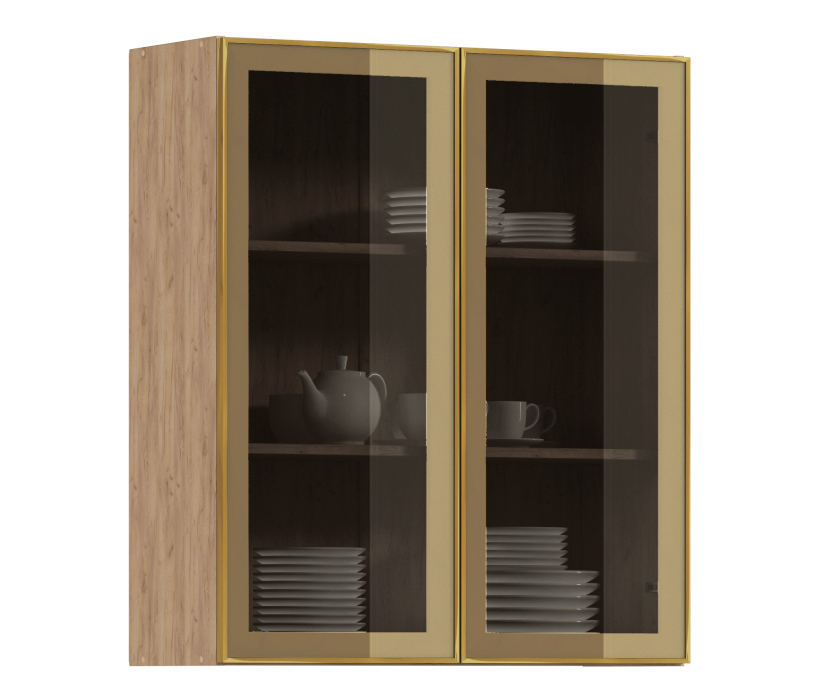 Комплект включает в себя корпус кухонной полки (цвета дуб вотан) с необходимой фурнитурой, фасад из алюминиевой рамки золотого цвета и бронзового стекла, а также ручку, соответствующую цвету рамки фасада.