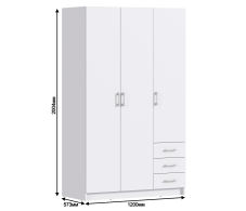 Габаритные размеры шкафа Терра: ширина 120 см, высота 200 см и глубина 57 см. Он может быть отдельным предметом мебели, а также частью гарнитура. Шкаф имеет вместительное плательное отделение со штангой, над которым расположена антресоль и отделение с полками и тремя выдвижными ящиками, где можно хранить мелкие аксессуары. Выполнен шкаф из прочного и качественного ЛДСП. Цвет Белый.