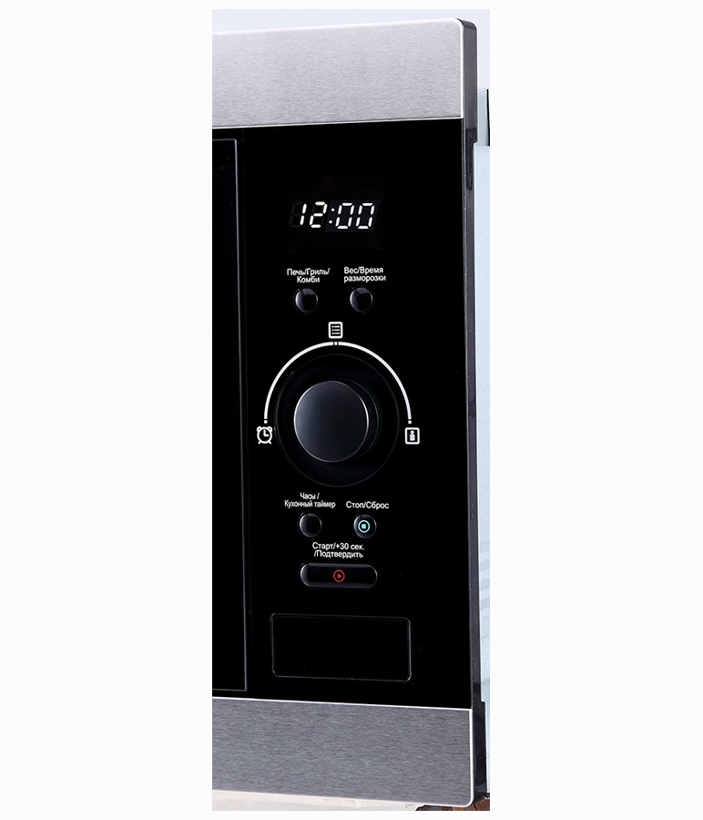 Встраиваемая микроволновая печь с грилем, панель: черное стекло+нерж, электронное управление, LED дисплей Cold White, объем печи: 25 л, функция гриля, 8 автоматических программ, функции разморозки по весу и по времени, ниша встраивания (ВхШхГ), мм: 380х560х550
