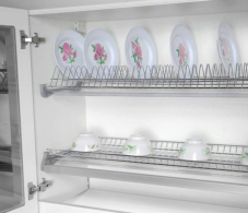Сушилка для посуды двухуровневая встраиваемая в кухонный шкаф, база 450мм. Изготовлена из алюминия. Имеет пластиковый поддон. Предназначена для компактного хранения посуды.