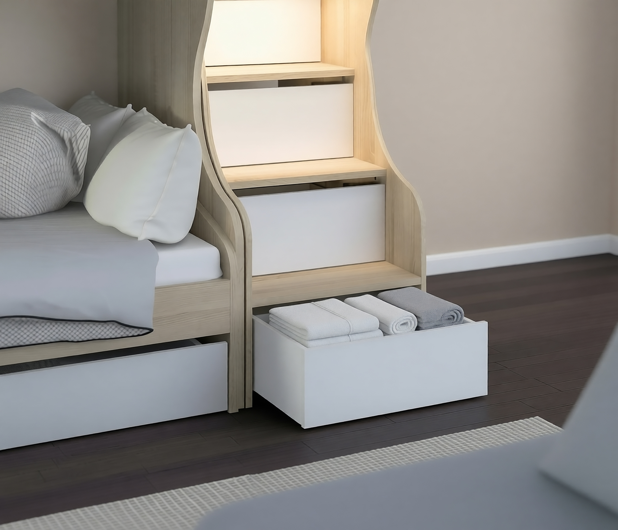 Приставная лестница для кровати служит дополнительным элементом к кровати-чердаку Мамбо СБ-2871. Ящики можно использовать для хранения.