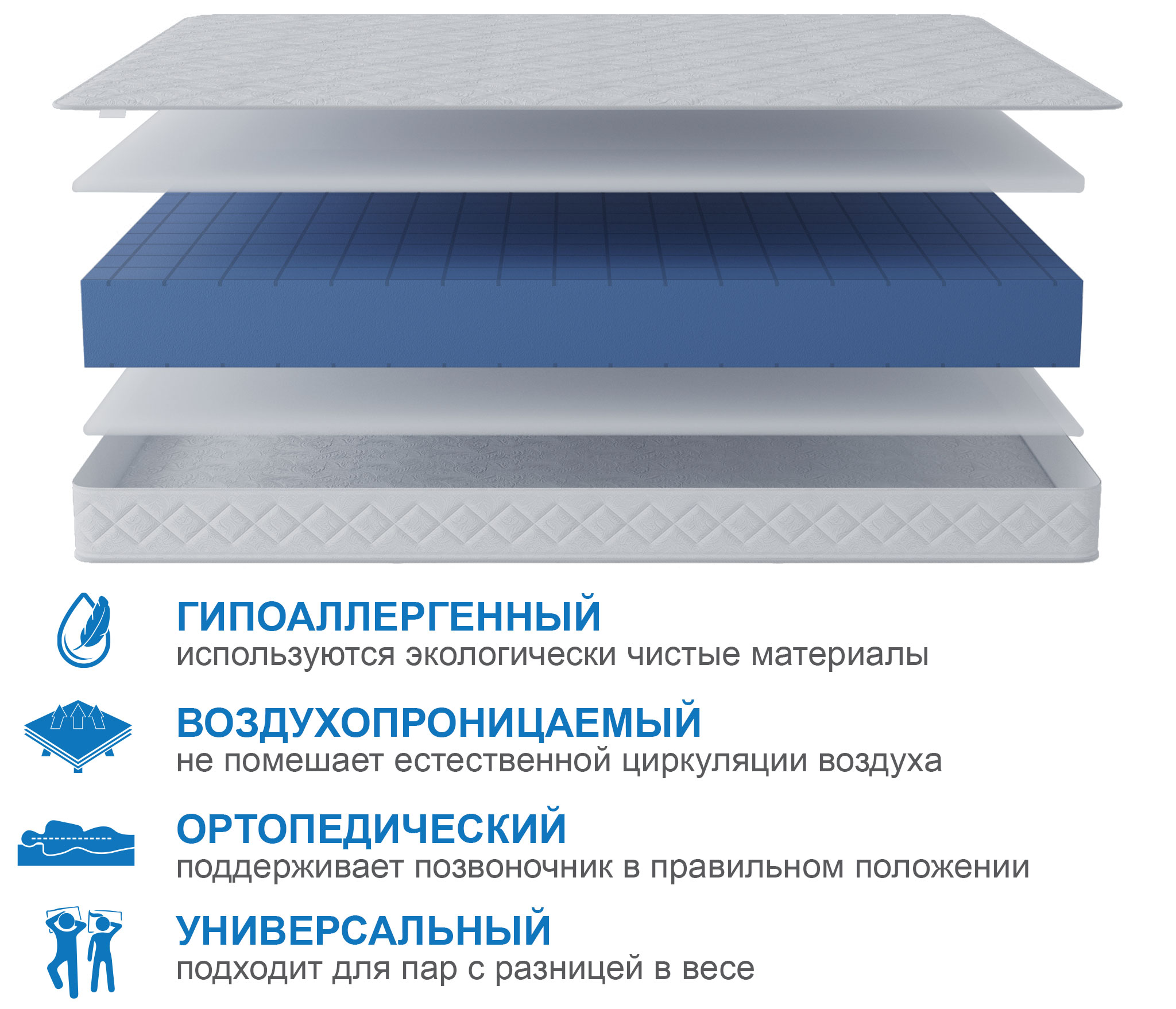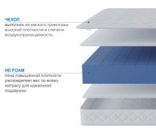 Уникальный бесклеевой и беспружинный матрас, в основе которого лежат передовые технологии умных пен. Данная пена прочная и долговечная, благодаря высокой плотности пены. Чтобы матрас не был чрезмерно жестким, обе стороны матраса перфорированы специальным образом. У нас получилось придать матрасу оптимальную жесткость, не снижая плотности пены.