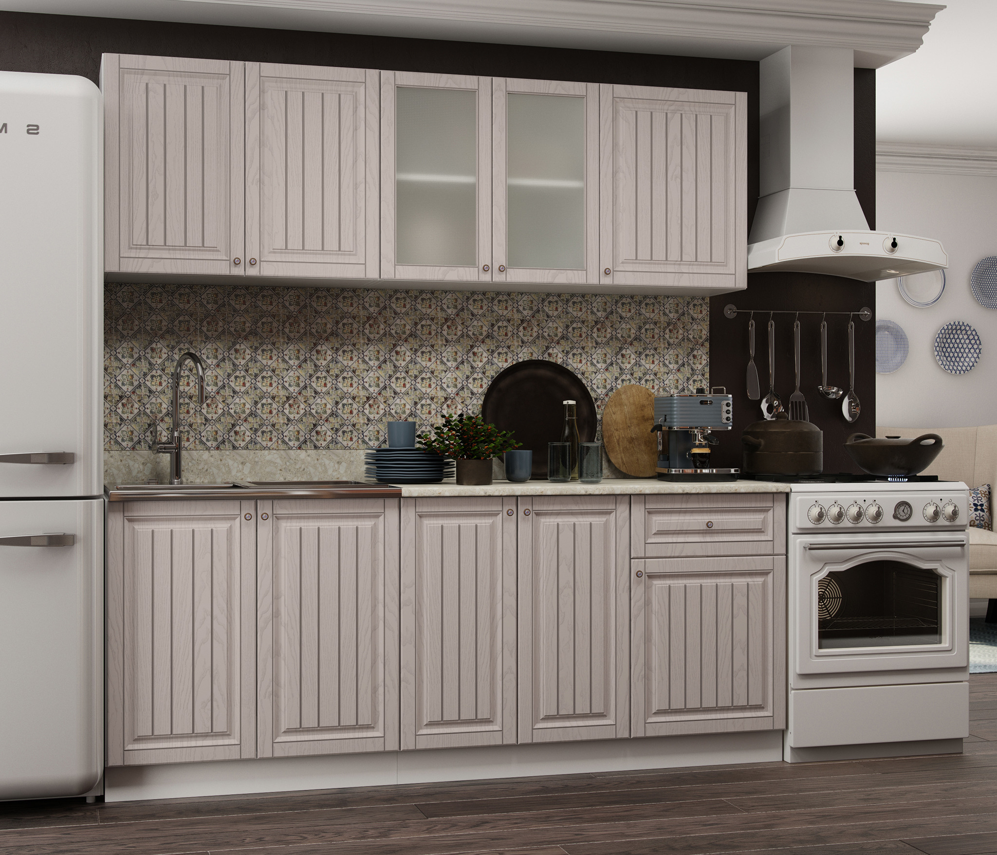 Сочетание цветов, фасады, нежные ручки, не прозрачное стекло.