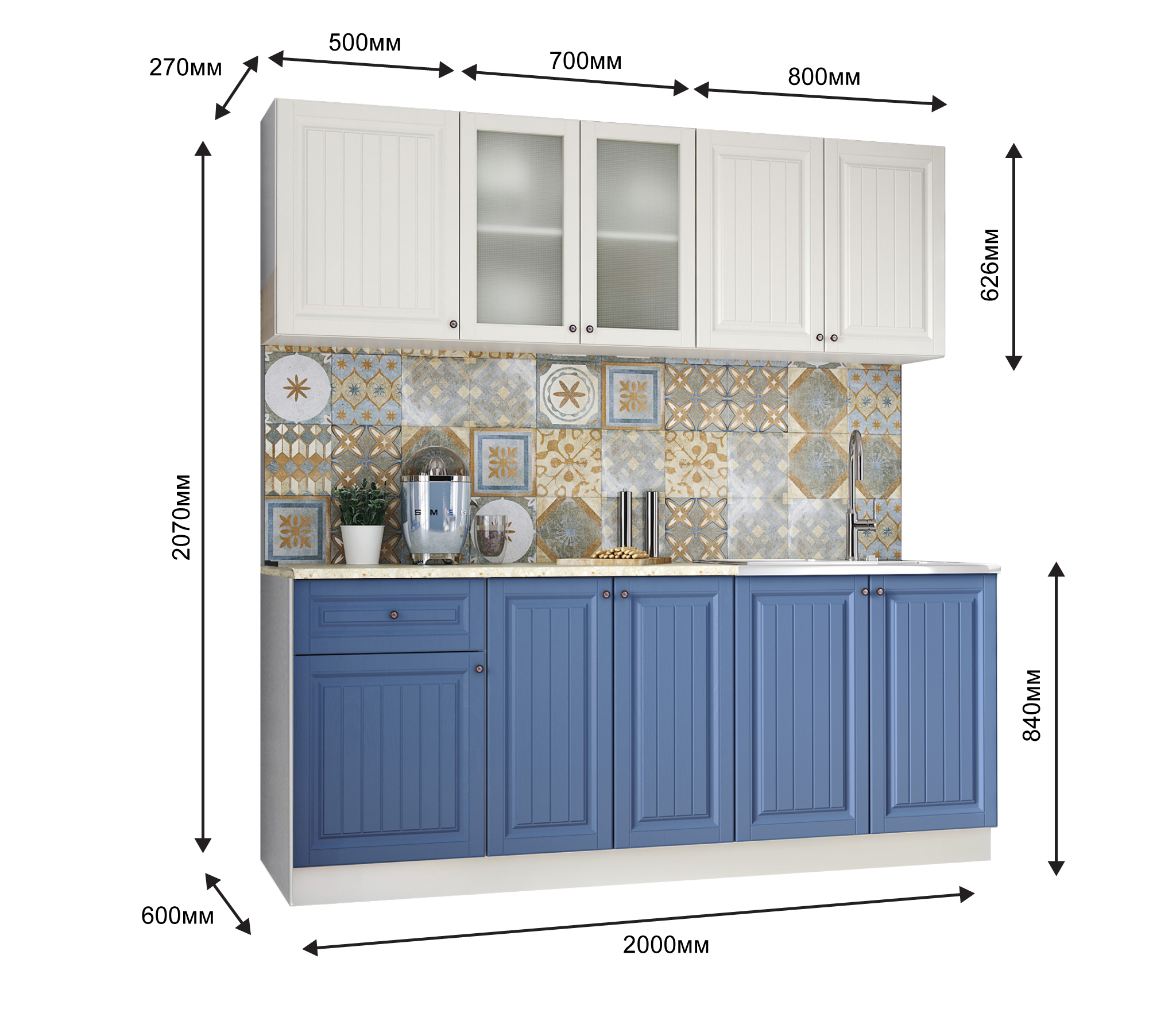 два верхних шкафа - общая ширина 1200мм (500мм , 700мм со стеклом) и на 800мм. Высота 626мм. Глубина 270 мм.