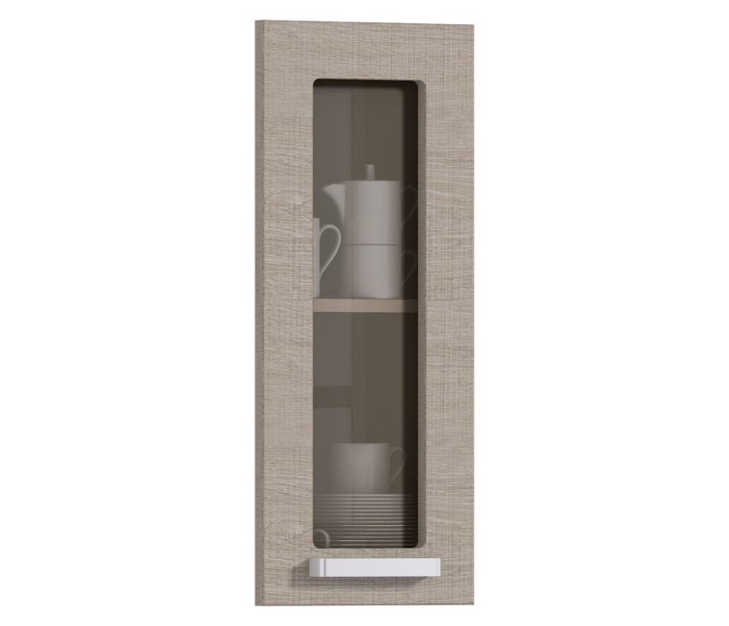 Компактная застекленная дверца для кухонного шкафа. Она открывается справа налево. Она выполнена из качественной прессованной древесины и каленого стекла. Можно выбрать дверцу цвета «дуб Ривер» или «вишня Барселона».