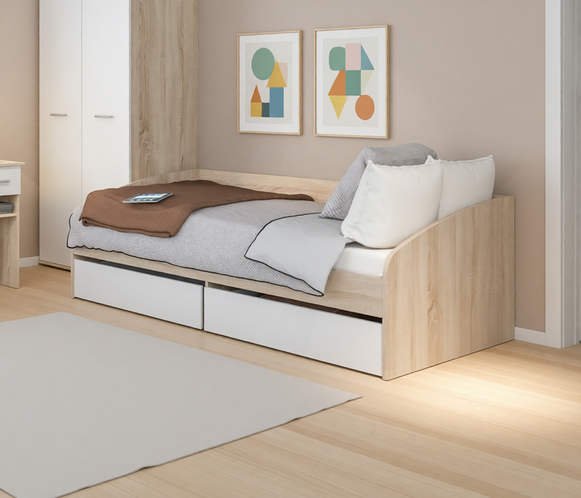 Кровать из детского гарнитура «Мамбо» – симпатичная и комфортабельная модель, воспользоваться которой могут даже взрослые члены семьи. Занимая не так уж и много места, она выделяется своей функциональной значимостью. Три в одном. Днем это вполне приличный диванчик, ночью полноценное спальное место шириной 95 см, к тому же, это и система хранения постельных принадлежностей, так как модель оборудована двумя объемными выдвигающимися ящиками. Кровать собрана из мебельных щитов повышенной прочности с износостойким поверхностным покрытием приятного пастельного оттенка «Дуб Сонома». Ящики и фасады к ним изготовлены из ДСП песочного цвета. Неброское сочетание цветов вносит в интерьер гармонию и умиротворение, что бывает нелишним, когда требуется успокоить разыгравшегося ребенка.