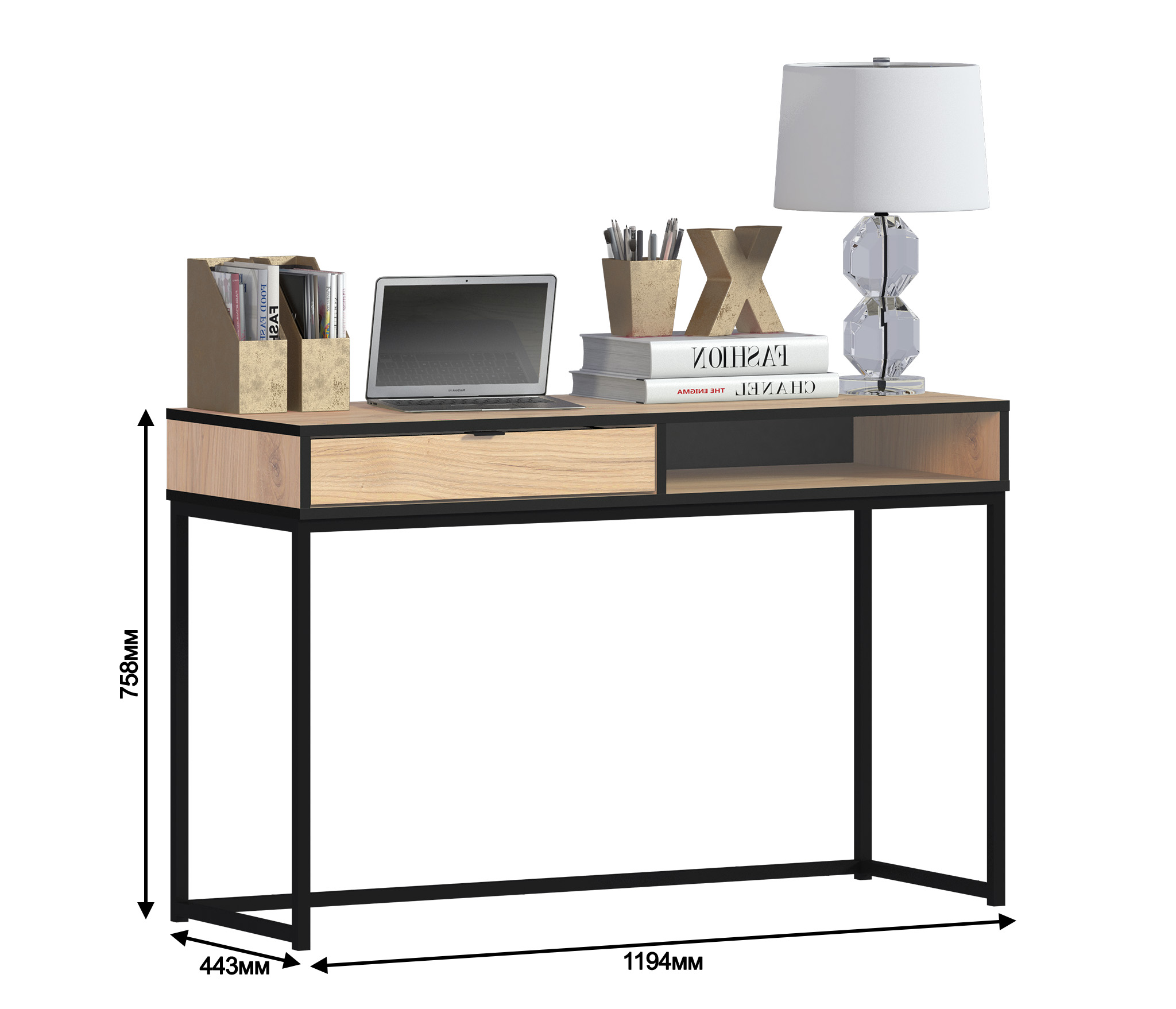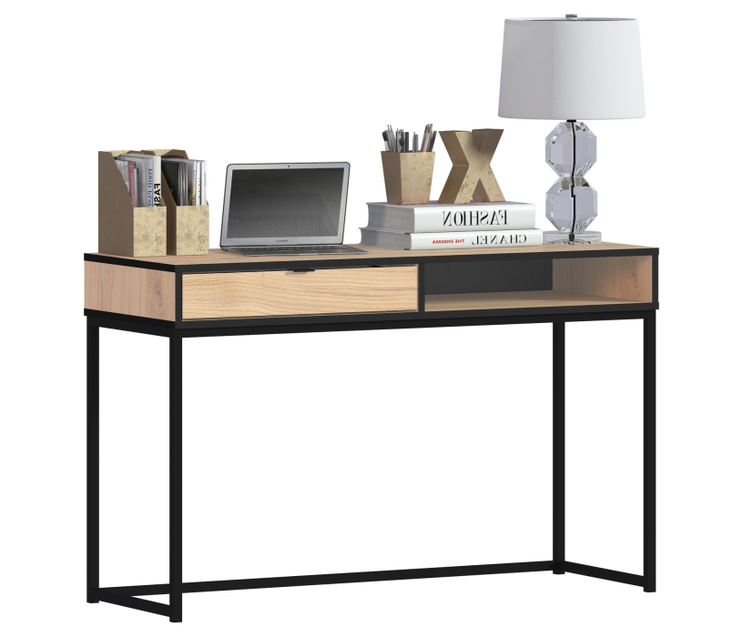 Стол Лофт СБ-3107 можно рассматривать как отдельный предмет мебели, а можно стилизовать его в гарнитуре. Стол достаточно компактен – ширина 119 см, высота 76 и ширина 44 см. Под рабочей поверхностью расположены открытая полка и выдвижной ящик для хранения книг, журналов, документов. Стол выполнен в, стиле Лофт и будет органично смотреться как в комнате школьника или студента, так и в кабинете или офисе. Материал ЛДСП цвет Дуб Минерва. Ножки металлические в черном цвете.