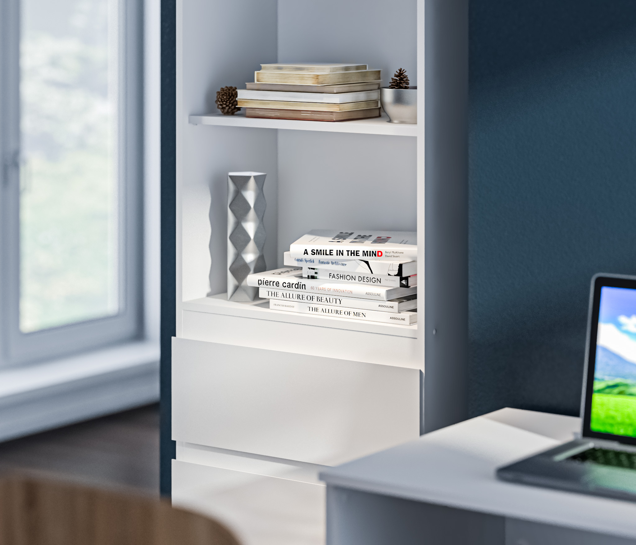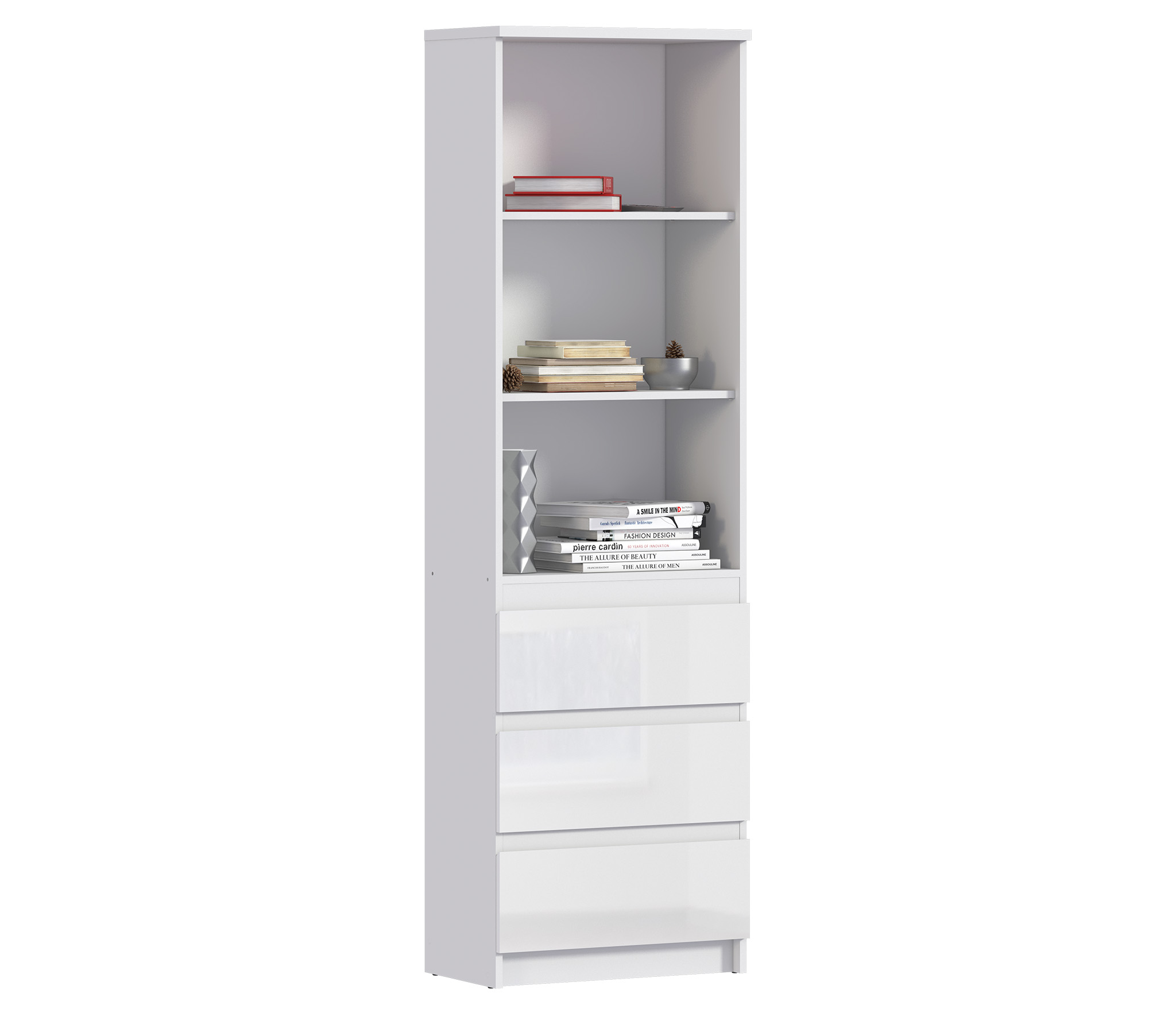 Производится стеллаж из современного материала ЛДСП. Корпус облицован декоративной пленкой белого цвета. Фасады выполнены в белом глянцевом цвете. Материал отделки устойчив к воде и бытовым чистящим средствам. Стеллаж можно стилизовать в модульную систему Медея.