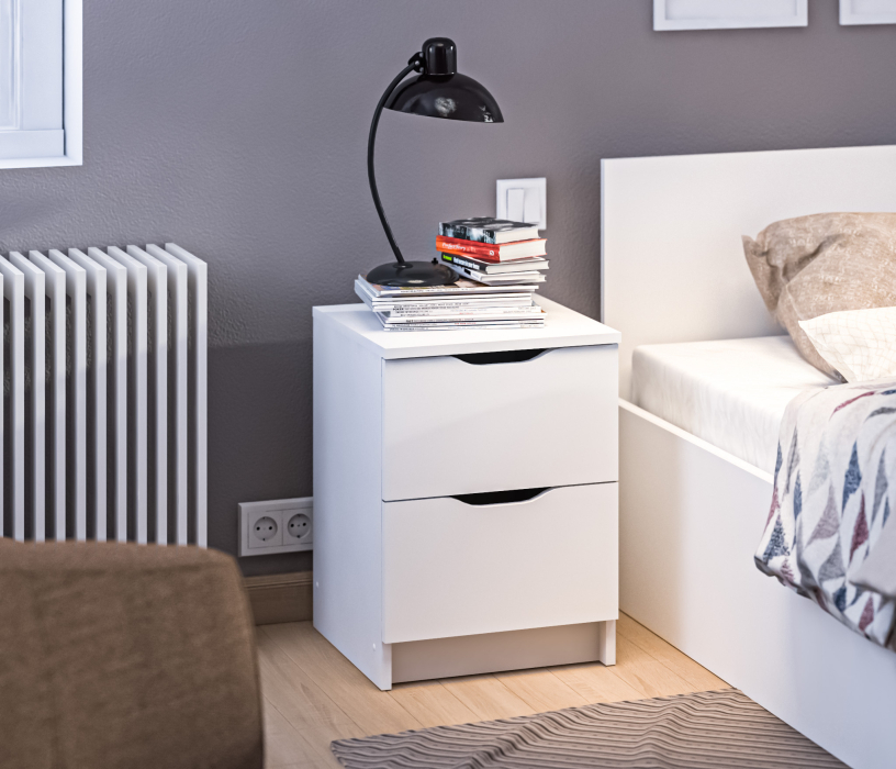 При компактных габаритных размерах – ширина 39 см, высота 53 см и глубина 39 см, тумба довольно вместительная. Под столешницей расположены два выдвижных ящика с прорезными ручками, где можно хранить вещи.