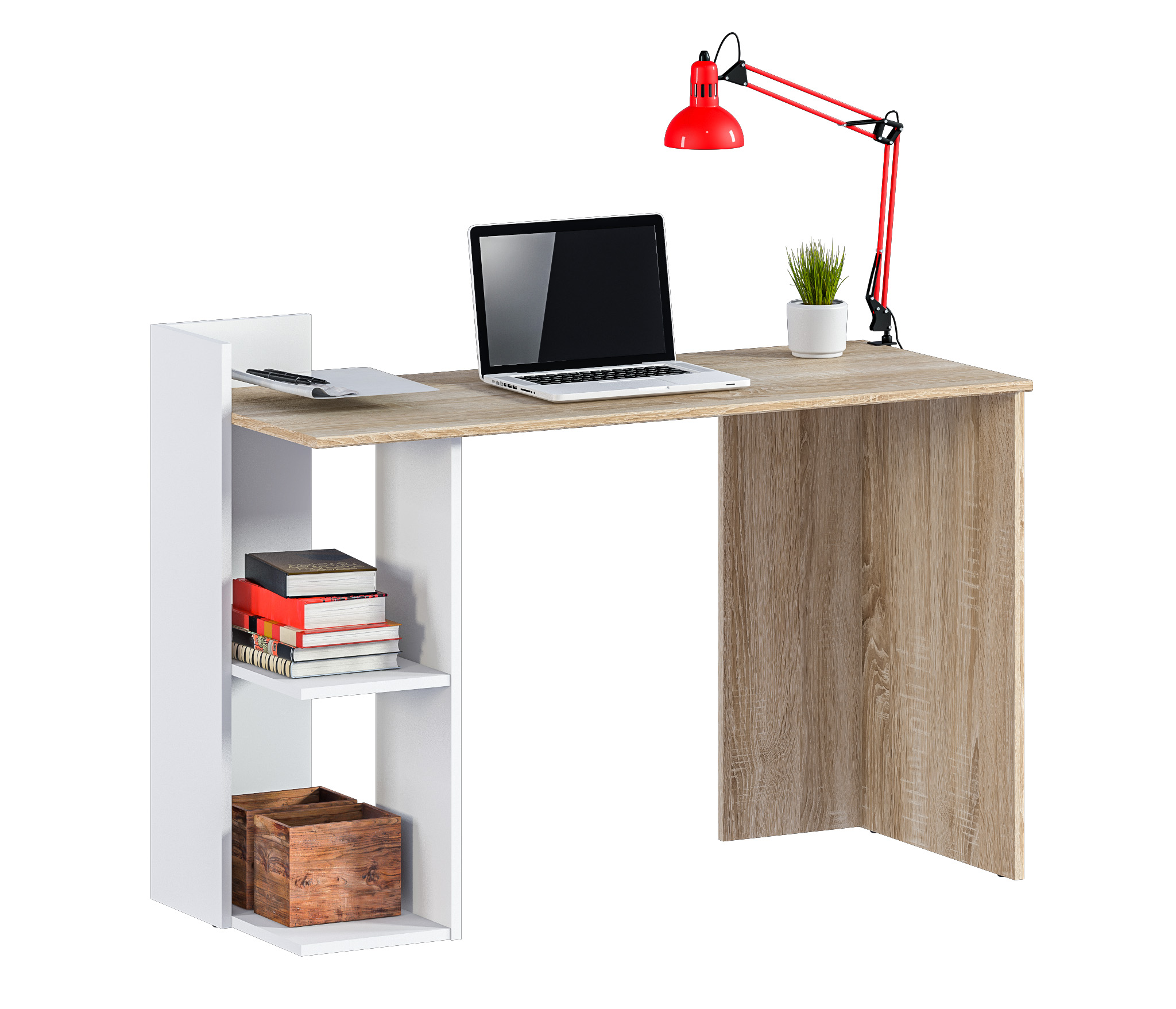 Стол Мамбо СБ-3340 – компактное и комфортное рабочее место. Такой стол не займет много места в комнате студента или школьника, а также будет органично смотреться в кабинете или офисе. Габаритные размеры стола Медея – ширина 120 см, высота 85 см и глубина 51 см. Под рабочей поверхностью расположена одна открытая тумба с двумя вместительными полками. Произведен стол из экологичного современного КДСП. Цвет отделки комбинированный: столешница в цвете "Дуб Сонома", а тумба в белом цвете. Лаконичный дизайн, компактные размеры создают ощущение легкости, и стол не выглядит громоздким. Стол Мамбо может быть стилизован в гарнитуре.
