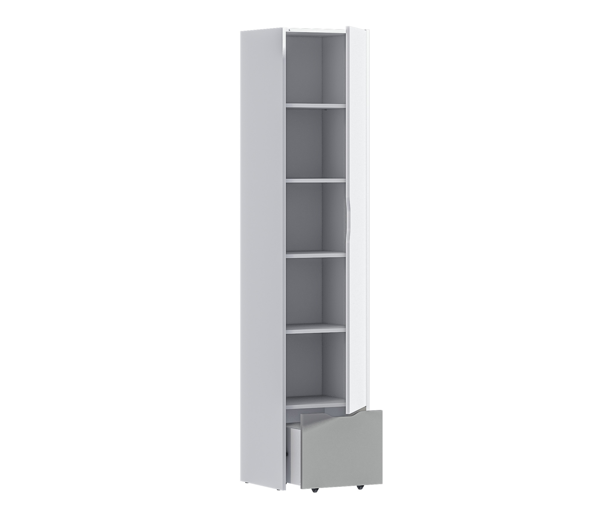 Корпус шкафа выполнен из прочного ламинированного ДСП, отделка в цвете «Белый альпийский». Материал фасадных поверхностей – ЛДСП в цветах отделки «Белый альпийский» и «Серый перламутровый». Вся мебель коллекции выполнена в лаконичном дизайне, без лишнего декора и безопасна в использовании.
