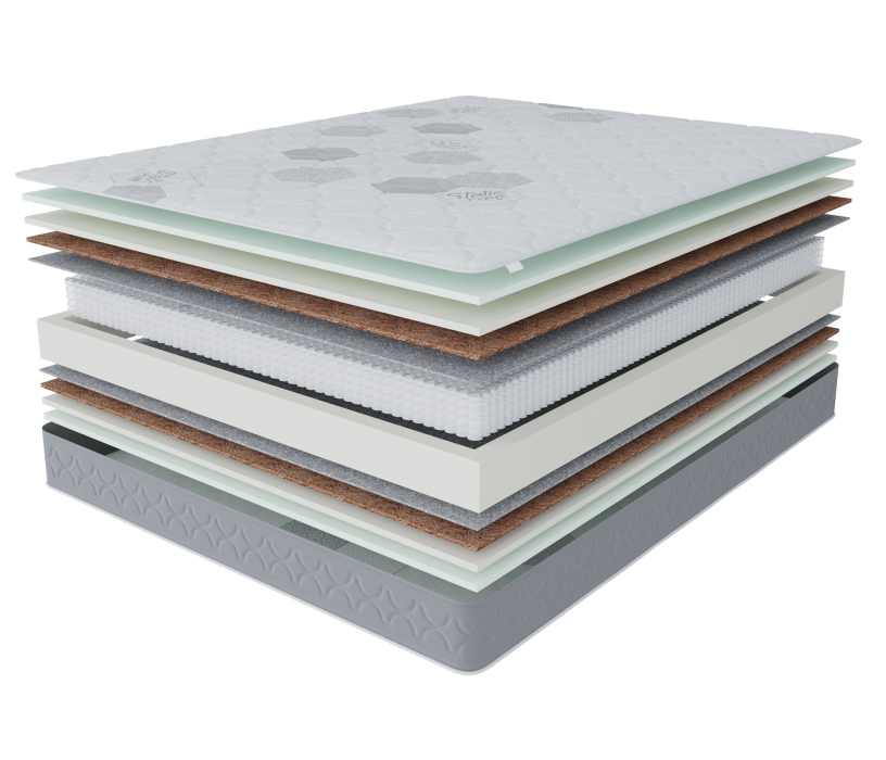 С обеих сторон матраса в качестве комфортного слоя используется 2 см искусственного латекса, этот материал очень долговечный и упругий, благодаря этому слою на этом матрасе будет одинаково комфортно людям разных весовых категорий. Для распределения нагрузки и придания необходимой жесткости используется латексированный кокосовый лист, который кладется под латекс. В основе матраса лежит блок независимых пружин, благодаря которому матрас будет индивидуально подстраиваться под каждого спящего и оказывать обратное давление только там, где это действительно необходимо. Чехол матраса сделан из плотного мягкого трикотажа, который стегается на 15 мм пене и синтепоне, что добавляет не много мягкости. Обращаем ваше внимание на то, что любой матрас отвечает за правильность положения во время сна нижнего и среднего отделов позвоночника, а за правильность положения шейного отдела отвечает правильно подобранная ортопедическая подушка. Рекомендуем использование с защитным чехлом AquaStop.