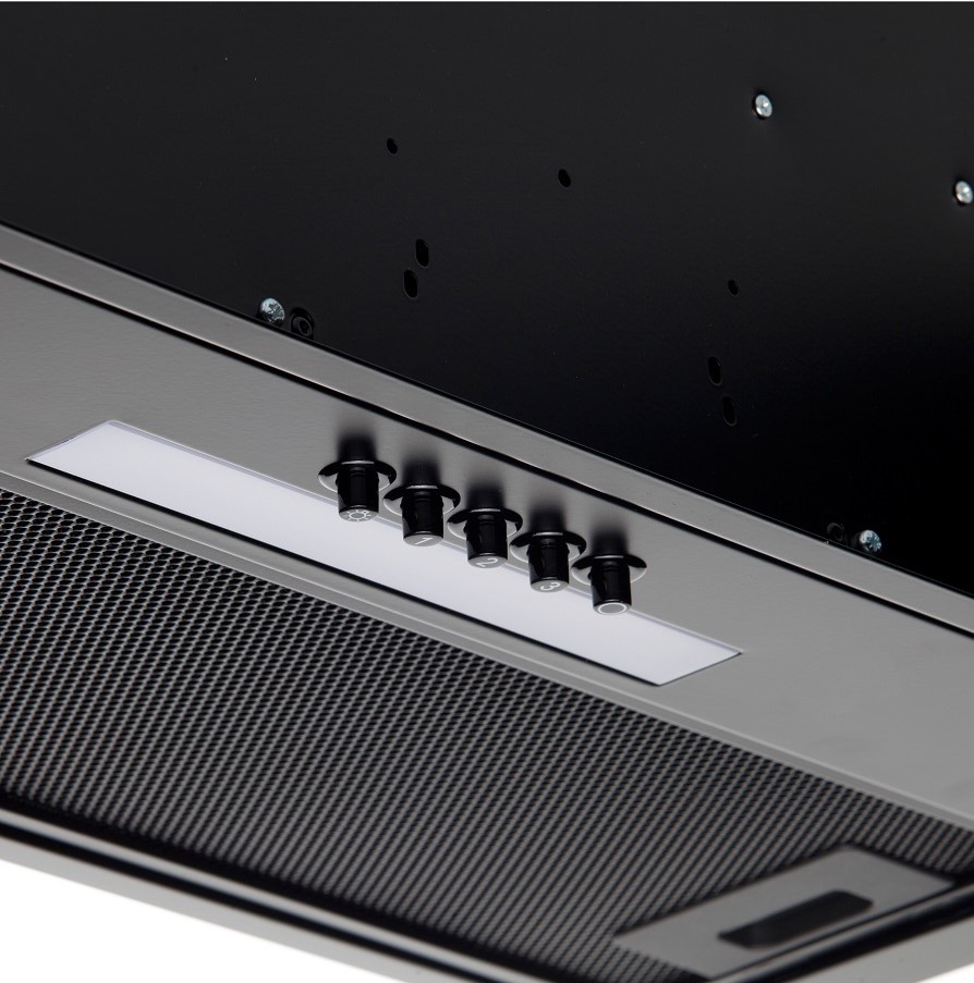 • Фасад вытяжки полностью закрывает нижнюю полку – это позволяет монтировать вытяжку в кухонные шкафчики вместо нижней полки (дна). Удобная система монтажа